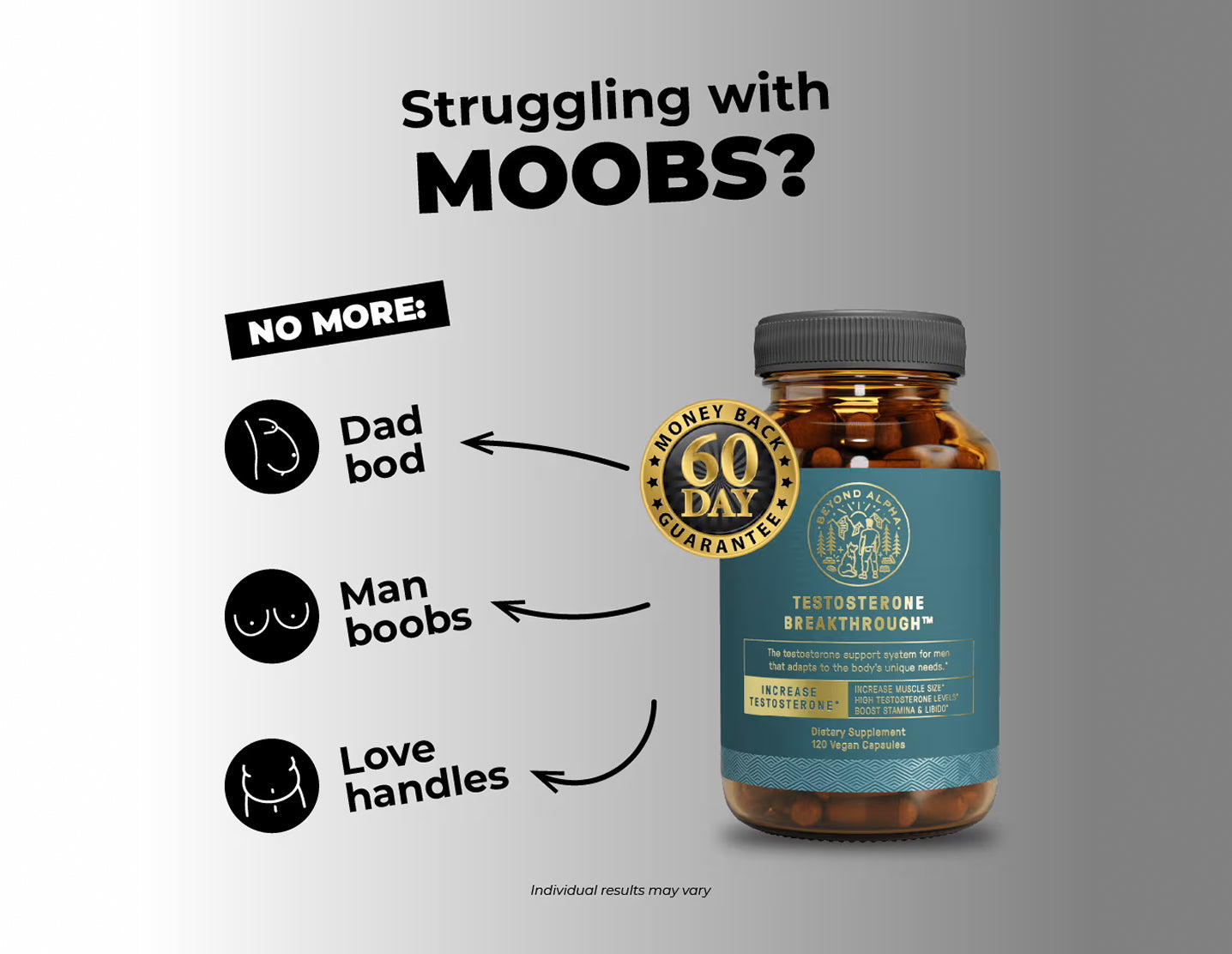 Our natural, manhood-boosting nutrients have been scientifically validated to work on men of all ages and with various low T symptoms like fatigue, lack of drive and motivation, weight gain, dad bod, man boobs, love handles, brain fog, and more.